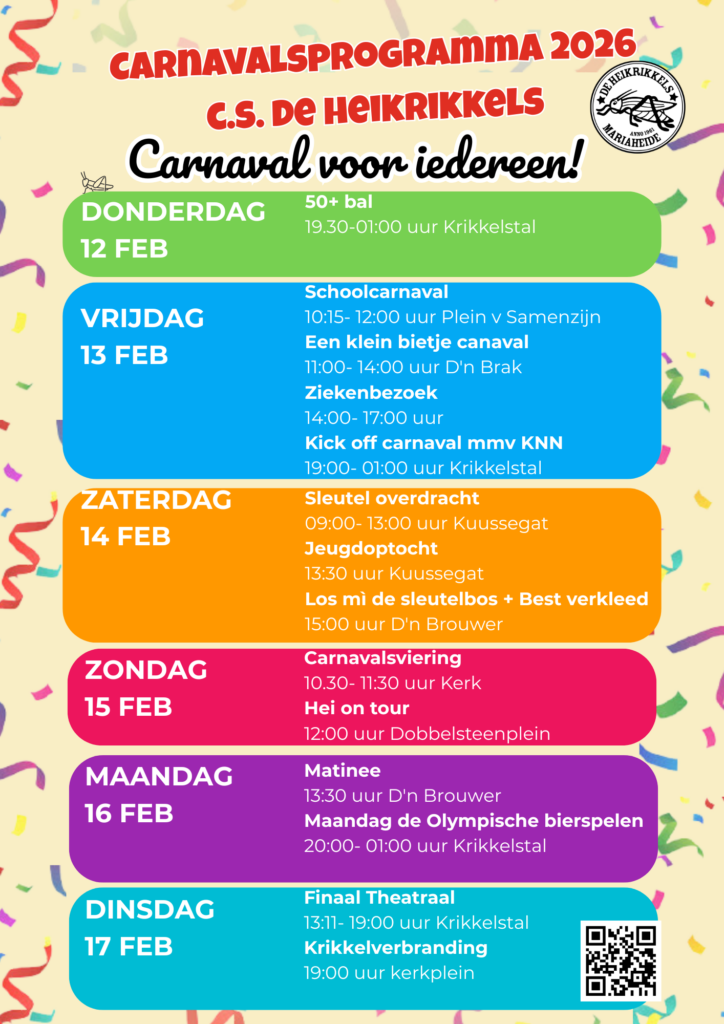Namens c.s. De Heikrikkels willen wij alvast aankondigen dat er in 2026 een nieuw carnavalsprogramma komt voor Mariaheide. Op dit moment zijn wij nog volop in overleg om een gevarieerd programma samen te stellen dat voor iedereen toegankelijk en gezellig zal zijn. Meer informatie over de invulling en de activiteiten volgt later. We hopen dat heel Mariaheide alvast dit goede nieuws deelt en met ons uitkijkt naar een prachtige carnaval in 2026!